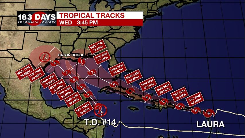 Tropical Depression Fourteen is located in the Caribbean Sea. It is forecast to become a tropical storm later today. Then, it will likely make a landfall over the Yucatan Peninsula in Mexico over the weekend. While it is expected to enter the Gulf of Mexico after crossing the peninsula, it is uncertain what the strength and placement of the storm will be at that time. This storm will also contribute to building moisture in the Gulf and rainy conditions for us here at home.