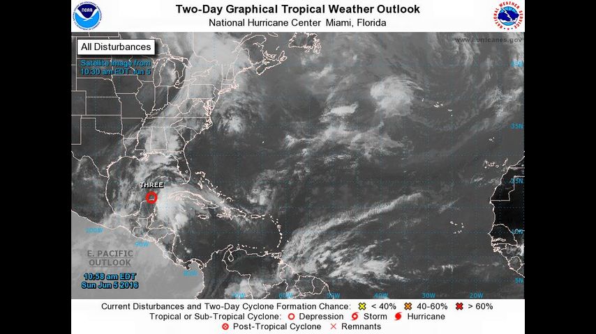 The National Hurricane Center said a hurricane hunter plane will investigate the storm near Mexico's Yucatan Peninsula Sunday afternoon. It already contained thunderstorms and near tropical storm strength winds.