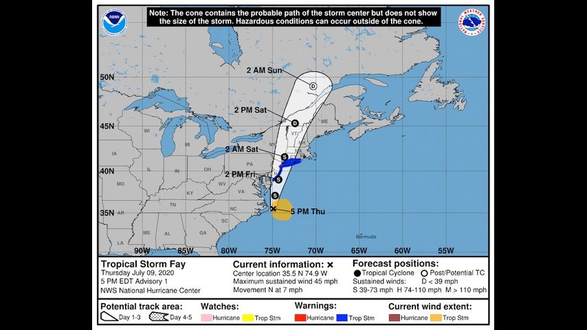 Fay is expected to bring strong winds and heavy rain to portions of the eastern US. Maximum sustained winds are 45mph and it is moving north at 7mph.