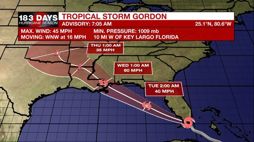 Tropical Storm Gordon forms near the upper Florida Keys. Surface observations from the Keys and radar data indicate that sustained winds have reached tropical storm status at 45 mph. Gordon is currently located about 10 miles west of Key Largo, Florida and 30 miles east of Cape Sable, Florida. Sustained winds of 45 mph are associated with this storm, as it is moving toward the west-northwest at 16 mph. Current tropical storm warnings are in affect from the border of Florida and Alabama through to just east of St. Mary Parish. A Flash Flood Watch is also in affect from Tuesday to Thursday across our area.