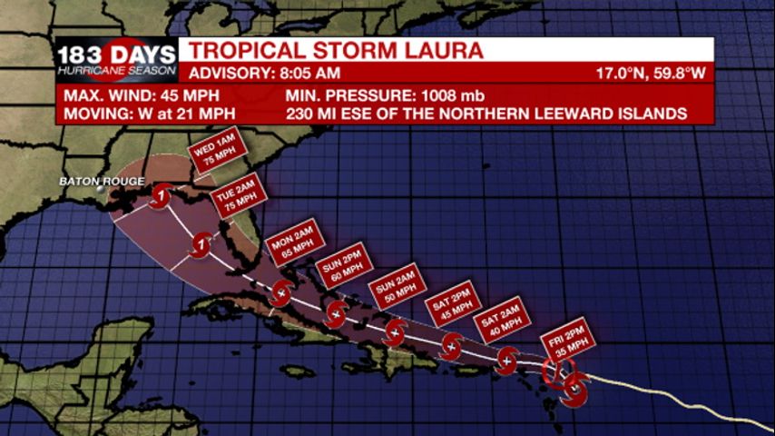 Tropical Storm Laura has formed in the central Atlantic with maximum sustained winds of 45 mph. Laura is moving west at 21. This system will face very few obstacles to strengthening as it continues moving at a similar speed and direction across the southwest Atlantic. The only thing that could change, is if is pushed a bit farther south and moves over the Caribbean Islands, which would send a much weaker storm toward Florida and the Gulf. However, at this time, it appears a hurricane will enter the eastern Gulf of Mexico early next week. From there, it is expected to turn northwest and parallel the west coast of Florida. If this plays out, impacts to the Baton Rouge area should be minimal. If it jogs farther west, the local area could experience additional rain or tropical storm conditions.
