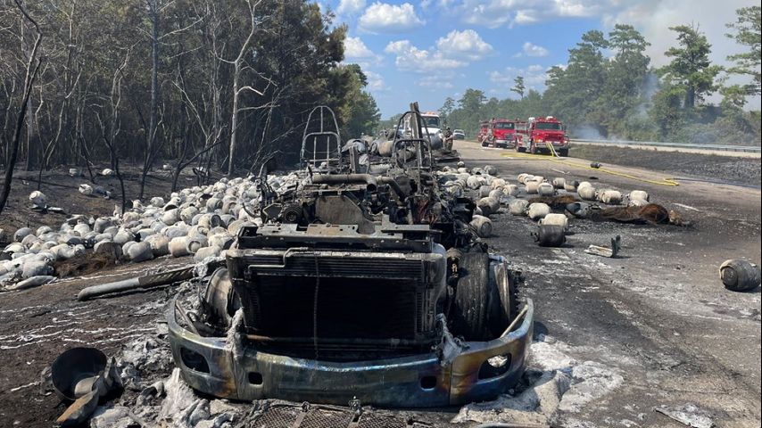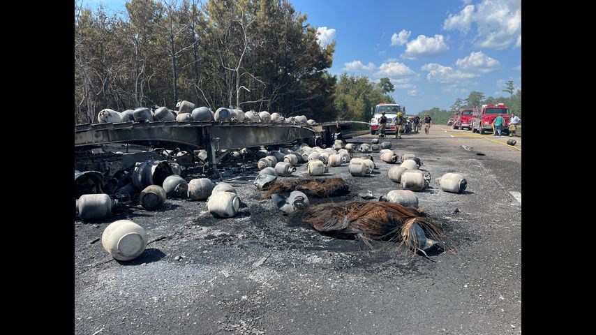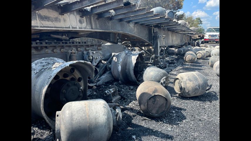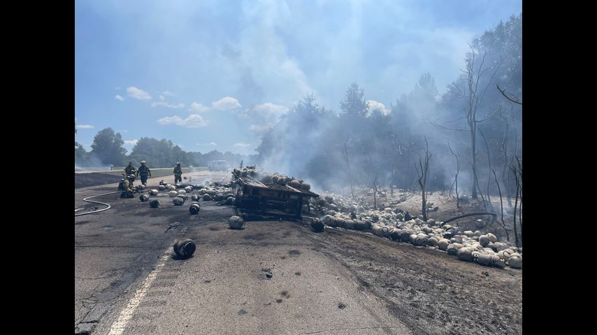 Pictures shared by the Mississippi Highway Patrol showed the remnants of the truck and ashy propane tanks scattered on I-59 outside of Poplarville. Tanks covered the road and flooded the bar ditch.