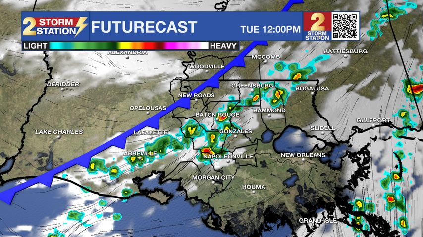 Today & Tonight: Throughout the morning, a few showers and thunderstorms will be possible, especially northwest of Baton Rouge. As a cold front slowly slides southeast, rain chances will increase for the rest of the area, peaking out around midday. Drier air will move in by the evening, eliminating all rain and storms. Skies will clear, and temperatures will drop in the overnight hours. Lows will bottom out near 54 degrees, so light jackets are a good idea in the morning!