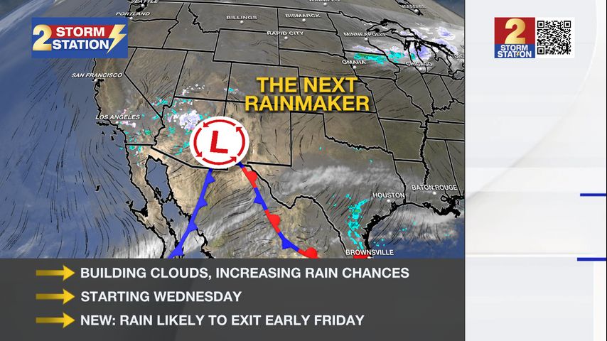 After a warm and mostly cloudy day Thursday, a cold front will move through the state from west to east Thursday night. The front will support numerous showers and thunderstorms. Latest data suggest this system will enter western Louisiana late Thursday afternoon and eventually push through the Capital Area overnight. While we area still a few days out and cannot nail down exact timing, data continues to trend in a much drier Friday than originally anticipated. In fact, most of the rain could be off to the east by the peak hours of Friday morning's commute. Make sure to check back in with the Storm Station this week for the latest. Severe weather is not expected; and up to an inch of rain will be possible with this round.