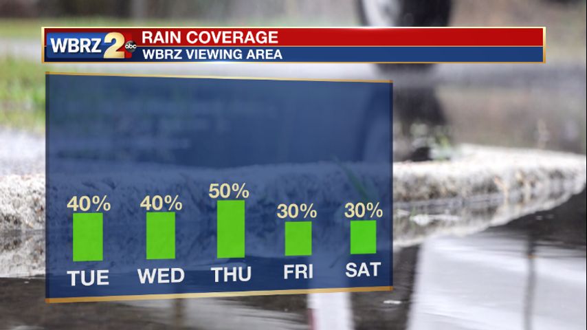 Up Next: This pattern is set to repeat every day this week. Keep your umbrella and your sunglasses close by. You may need both at any time throughout the week. Expect the morning hours to be mostly dry throughout the week. If you need to get out and do yard work, the morning hours are more ideal. Not everyone will see rain every afternoon, so you will be able to dodge the showers if you keep your WBRZ WX App close by. About 30-50% of the viewing area will see a shower each afternoon. Temperatures in the afternoon will max out in the low 90s and overnight lows will be in the mid-70s. Check back in every day for a look at the futurecast for an idea of where the afternoon showers will bubble up. Click here to see the 7-day forecast.