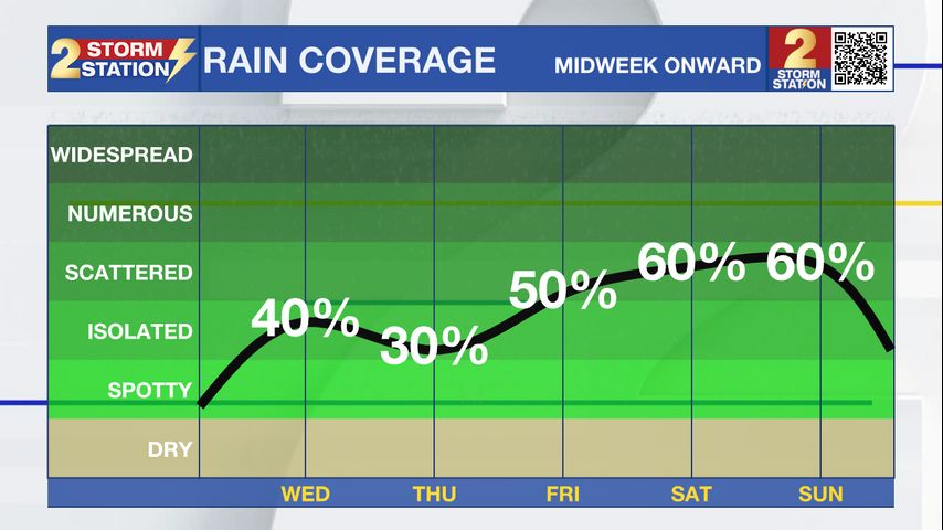 Temperatures Staying Warm – Afternoon highs in the 80s will stick around despite the uptick in rain chances. Overnight lows will also trend milder, with temperatures barely dipping into the mid-60s by the end of the week.