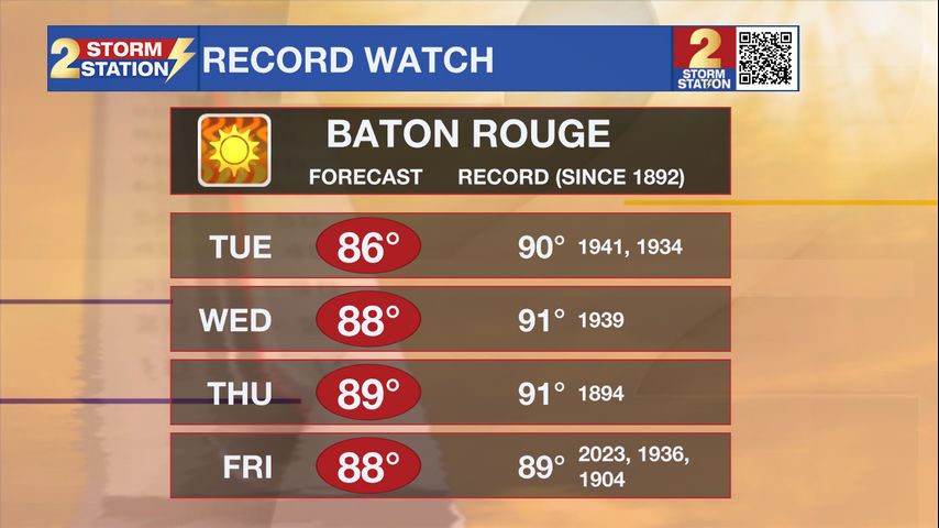 Today & Tonight: A cool start in the low to mid 50's Tuesday morning will be followed by a warm afternoon around 30 degrees warmer. Expect a high temperature near 86° in Baton Rouge today with plenty of sunshine. Conditions remain dry and winds stay light out of the northeast. Overnight, temperatures will return to the middle 50s for another cool morning.