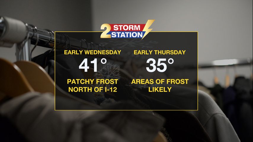 A weak and dry cold front welcomes cooler temperatures to the state overnight. Temperatures by Thursday could allow for frost to form around parts of Louisiana and Mississippi. This weekend, warmer air returns as well as the chance for showers and storms.