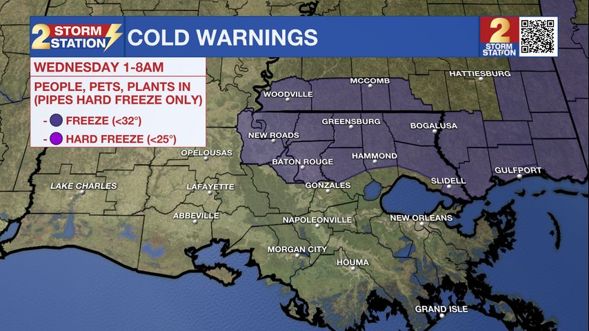 Tonight & Tomorrow: Tuesday night will feature clear skies, light winds, and low humidity – a classic recipe for cooling off very efficiently. We’ll see a low temperature in the middle-30s in Baton Rouge. However, areas outside the city could reach the freezing mark. A *FREEZE WARNING* is in effect overnight and early Wednesday along and north of I-10/12. The purple-shaded parishes and counties have the greatest chance of nearing the freezing mark. You’ll want to protect tender plants from the cold by covering them up or bringing them inside, even if you’re a parish or two south of the Freeze Warning. Make sure outdoor pets and animals also have warm shelter.