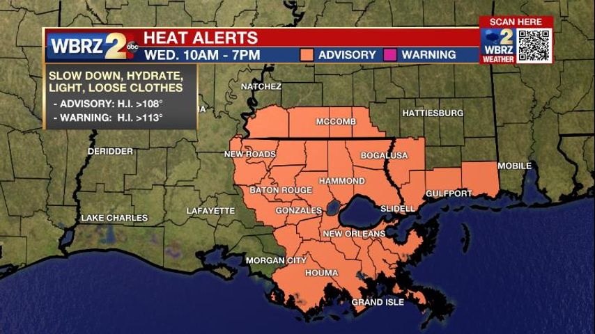 On Wednesday, a HEAT ADVISORY will be in effect for the entire WBRZ Weather Forecast Area (except St. Mary Parish) from 10am to 7pm. Expect the feels-like temperatures to range from 108 to 112 degrees during the hottest part of the day. Hot temperatures and high humidity may cause heat illnesses to occur. Drink plenty of fluids, stay in an air-conditioned room, stay out of the sun, and check up on relatives and neighbors. Young children and pets should never be left unattended in vehicles under any circumstances. Take extra precautions if you work or spend time outside. When possible reschedule strenuous activities to early morning or evening. Know the signs and symptoms of heat exhaustion and heat stroke. Wear lightweight and loose fitting clothing when possible. To reduce risk during outdoor work, the Occupational Safety and Health Administration recommends scheduling frequent rest breaks in shaded or air conditioned environments. Anyone overcome by heat should be moved to a cool and shaded location. Heat stroke is an emergency!