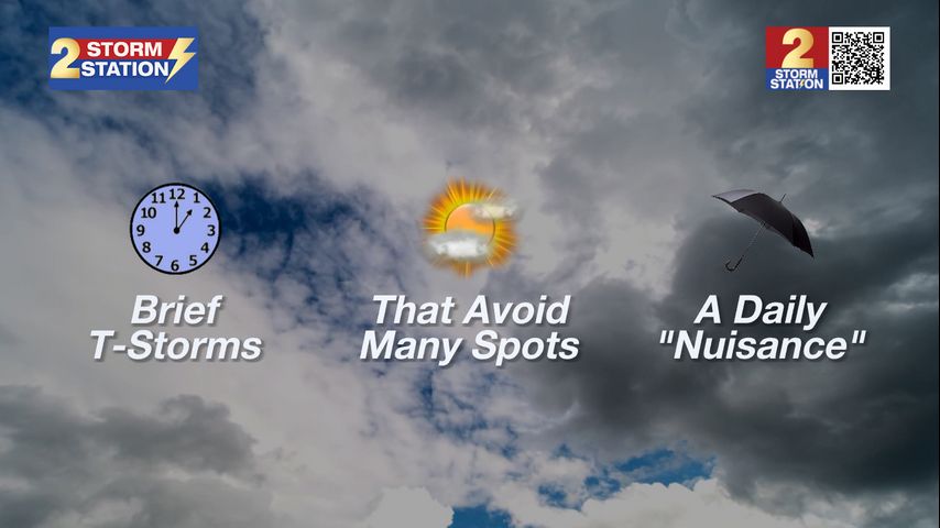 Up Next: The showery and muggy pattern will stick around through the end of the week. Scattered showers and thunderstorms will be a fixture of each afternoon, though not every neighborhood will see rain every day. Most neighborhoods should pick up between 1 inch and 3 inches of total rainfall by early next week. Widespread flash flooding is unlikely, but some storms could produce brief ponding on roads in isolated areas. Fortunately, severe weather is not expected.