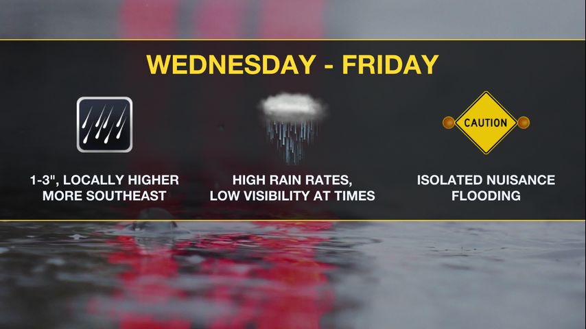 Through Friday, an upper level trough of low pressure will create more instability (energy for rain, thunderstorms) across the central Gulf Coast. At the same time, total moisture in the atmosphere will climb to well above average level. The combination of these two features will result in numerous to widespread showers and thunderstorms each day. The ripe storm environment will also return the possibility of a low end flood risk to where some street and poor drainage issues could occur. Rain rates could be particularly high with these storms, making visibility difficult if it overlaps with any commutes.