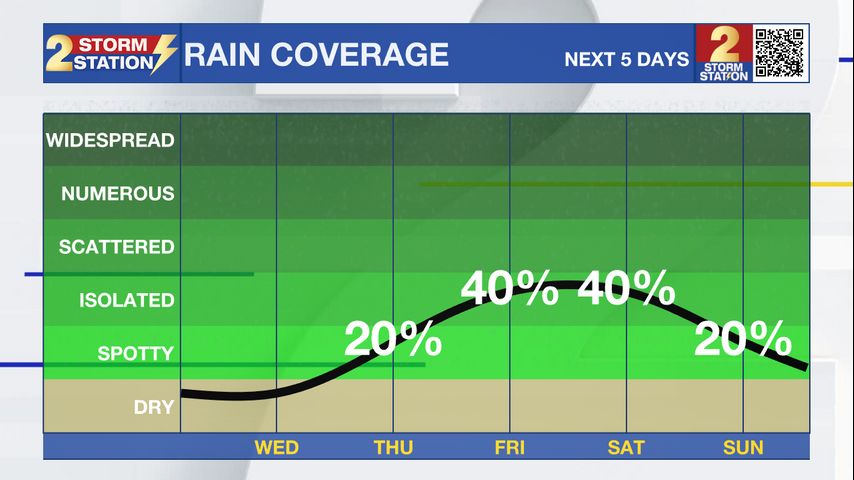 Up Next: Moisture will gradually build into the atmosphere on Thursday. As this happens, we’ll introduce the possibility of a spotty shower or thunderstorm after high temperatures return to the low 90s. Friday and Saturday will bring the best conditions for showers and thunderstorms within the Storm Station 7-Day Forecast. A combination of above average moisture and added instability will result in isolated to scattered showers and thunderstorms each day. Neither looks like a washout and area rain coverage will be on the order of about 40 percent, with higher chances near the coast and lower chances in southwest Mississippi. Sunday into Monday, moisture will diminish a bit as we await the arrival of a cold front early next week. This front could spell another push of much drier air and cooler temperatures.
