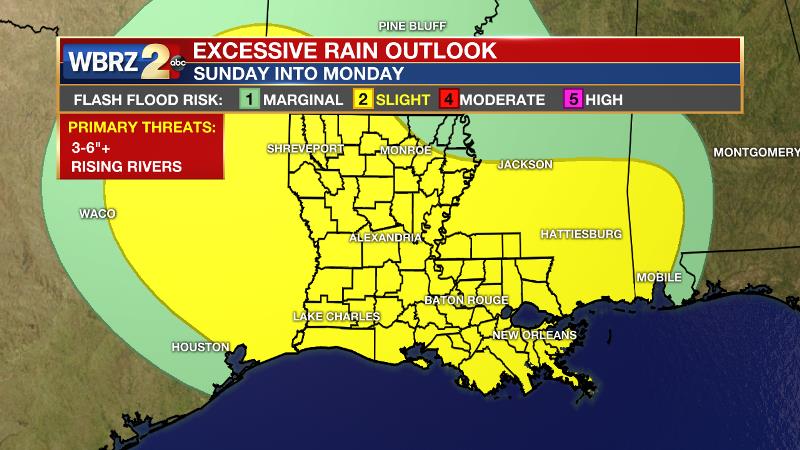 THE SCIENCE: A cold front has moved through the area and lower dew points are resulting in lower humidity. In fact, drier air is noted all the way into the upper levels and with a ridge moving overhead between now and Saturday, mainly clear skies are anticipated. With the ridge and drier air combining, high temperatures will continue to run warmer than average by 5-10 degrees. The weather will once again turn active by the second half of the weekend. A strong shortwave trough will move from the Four Corners into the Lower Mississippi River Valley. Forecast models show a complex surface setup on Sunday morning with an area of low pressure in south Texas and an associated warm front across the northern Gulf. Another surface low will be positioned near the Texas/Oklahoma border. These features are expected to merge as the warm front lifts into the Southern U.S. and the upper trough deepens and becomes negatively tilted near the Texas/Louisiana border. Strong positive vorticity advection and frontal lift will cause a shield of rain to develop by Sunday Afternoon. PWATs (atmospheric moisture) will quickly increase to 2” or two times the normal for this time of year allowing thunderstorms to be very efficient rain makers. Periods of heavy rain are then expected through at least the first half of Monday with the Weather Prediction Center (WPC) forecasting 3-6” of rain for Southeast Louisiana and Southwest Mississippi. The area is now included in a “slight risk” in the excessive rain outlook which means there will be a 15 percent chance of flash flooding. There is also a “slight risk” for severe weather for the western half of the forecast area per the Storm Prediction Center (SPC). Forecast models depict a situation worth watching closely. The track of the surface low raises some concern as it will position near the Louisiana/Arkansas border by Sunday Night with screaming low level winds on the order of 40-60 knots. 0-3km helicity (spin) could top out between 250-450 m/s, plenty sufficient for rotating storms. CAPE (instability) could be between 1,000 – 2,000 j/kg which is supportive of strong updrafts. Vertical speed shear is somewhat lacking though which could be a primary limiting factor to severe weather. However, a saturated atmosphere with lower column evacuation aloft would likely lean toward heavy rain being the biggest threat. Areal and flash flooding will be the main concern with this event though the situation will need to be monitored for severe storms. Runoff will also cause significant rises on area rivers—possibly above flood stage at some locations on the Amite, Comite, Tangipahoa and Tickfaw. Once that trough kicks through the region, quieter weather is expected for Tuesday. Another wave will trek across the U.S. on Wednesday which may send a cold front through our region. However, it looks as though the more northern position of the upper trough will keep the threat for high impact weather lower.