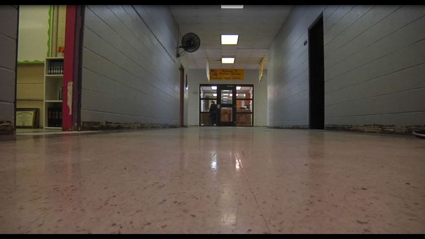 The campus was inundated with two and a half feet of water five months ago. The baseboards have yet to be replaced and shower curtains will be used for classroom doors.