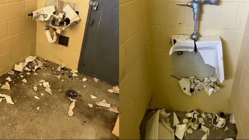Someone who went to the restroom called deputies after seeing the sink and urinal had been destroyed by a metal valve that was lying outside the restroom.