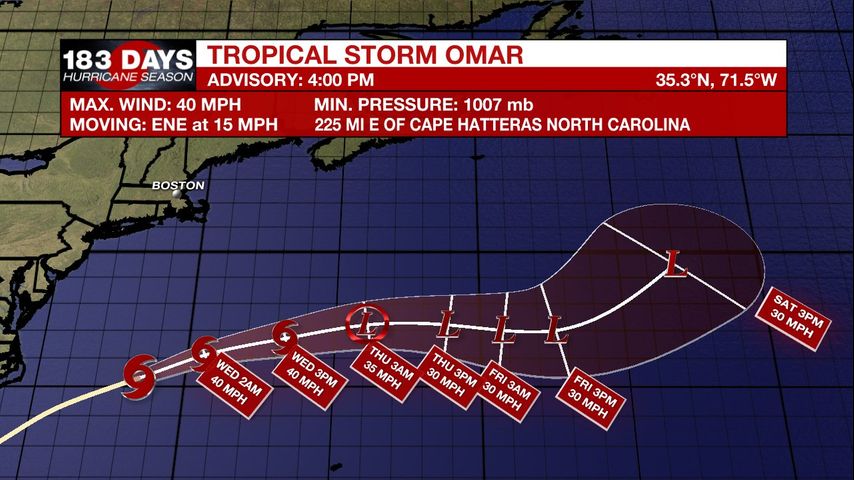 As of 4pm Tuesday, the second tropical storm of the day has been named in the Atlantic Basin. Omar formed during the afternoon hours. The system is drifting northeast and out to sea; it will not pose a threat to the United States. Omar is the earliest named O-storm, breaking the previous record held by Ophelia which formed on September 7, 2005.
