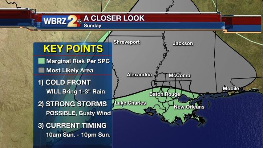 Into Sunday Morning, it will stay warm, breezy and muggy. Lows will be in the upper 60s. A squall line will move into the area by afternoon with a period of heavy rain and thunderstorms—with perhaps a few reaching severe limits. The National Weather Service Storm Prediction Center has placed our region under a “marginal risk” for severe weather indicating a 5% chance for a severe thunderstorm within 25 miles of a given point. The WBRZ Weather Team expects the most likely area for a severe thunderstorm to be along and north of I-12. The main threat would be gusty wind along the initial squall line. Once it passes, moderate to heavy rain may persist for a few hours. Right now, the most likely timeframe for active weather appears to be Sunday Afternoon.