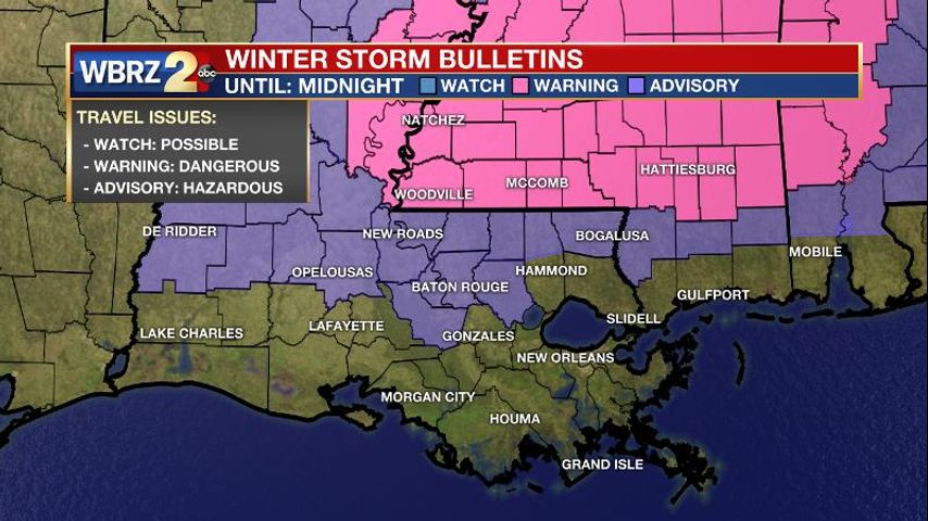 A *WINTER WEATHER ADVISORY* has been issued for East Baton Rouge, West Baton Rouge, Iberville, Livingston, Pointe Coupee, West Feliciana, East Feliciana, St. Helena and Northern Tangipahoa Parishes until 12am Saturday. This means wintry precipitation could cause slick road surface and you should use caution if driving is necessary.