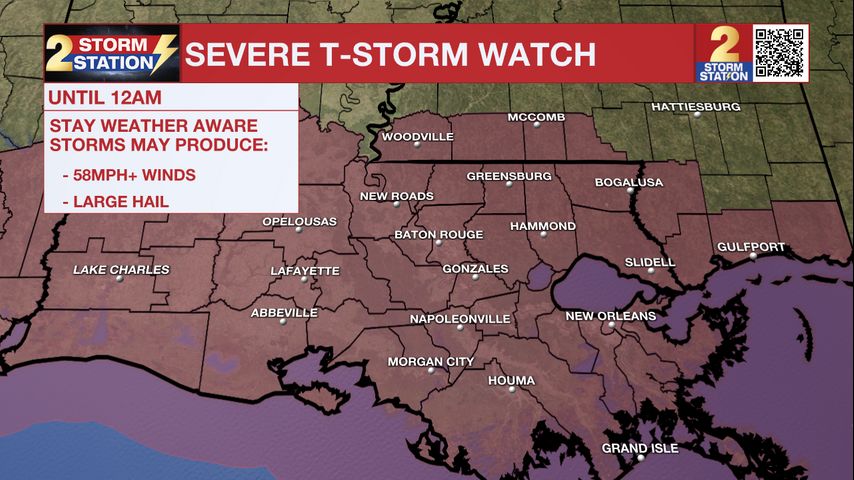 The National Weather Service has issued a SEVERE T-STORM WATCH for the entire WBRZ coverage area until 12 a.m. Tuesday.