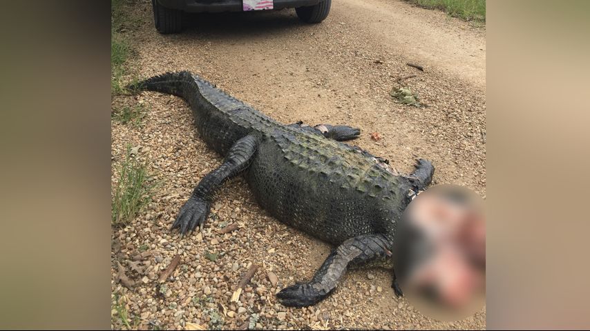 Photos sent in by a WBRZ viewer Friday evening show the body of the massive animal lying in the middle of Brian Road in Zachary. The man said the gator's head appeared to have been "carved up" and removed, leaving only some of the skin and tongue behind.