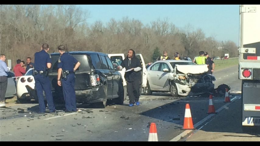 Six vehicles involved in this wreck. One injured, non-life threatening, per @LAStatePolice. One lane of traffic passing through. pic.twitter.com/A8vGJ4HhYo