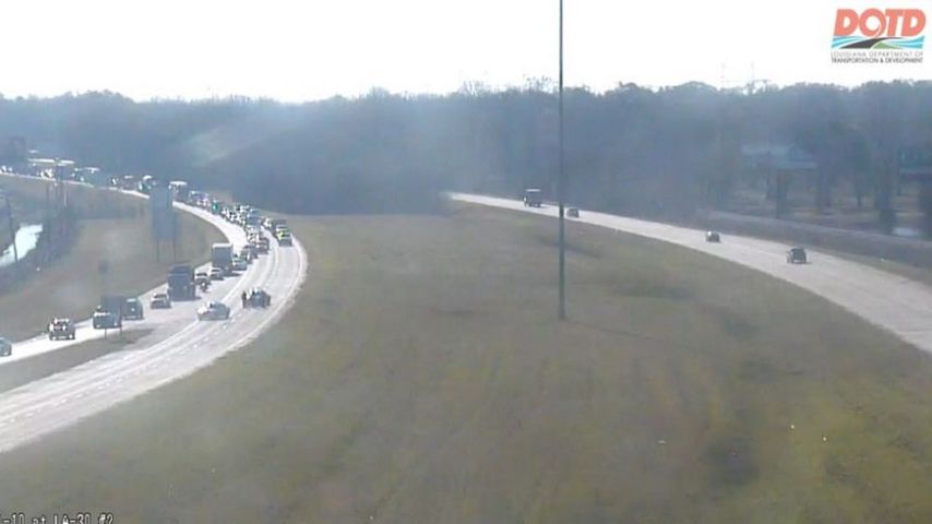 The left lane of I-10 eastbound was also closed a mile before LA 30. A vehicle appeared to be stuck trying to cross the median.
