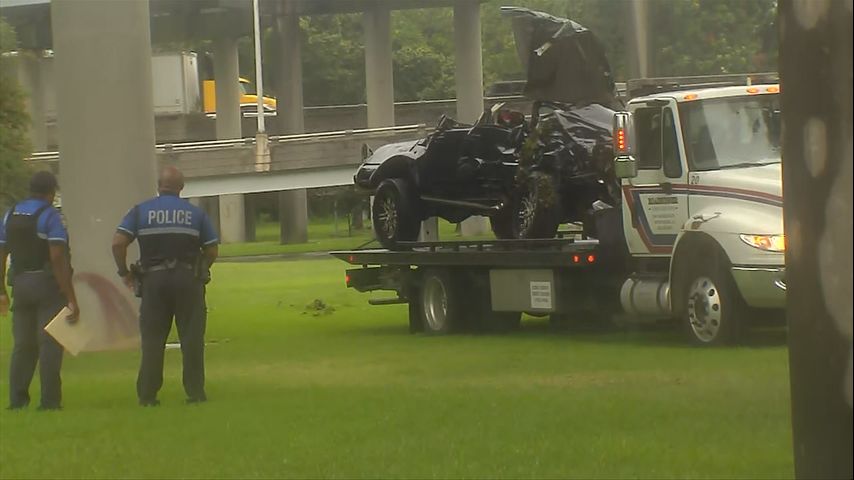 A vehicle was found crushed near the park, under the I-10/I-110 interchange, after the driver lost control and drove over the railing on I-110 South.