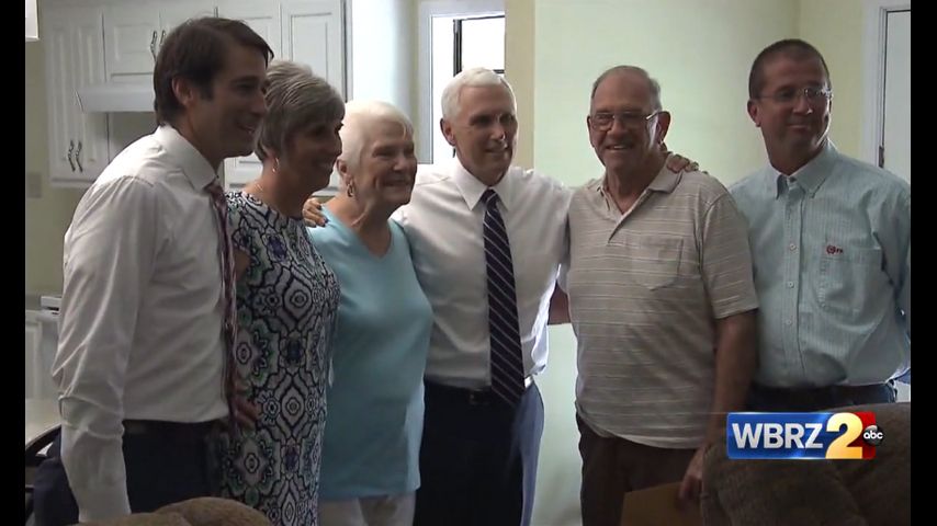 The family, Jimmy and Olive Morgan, got the unexpected visit from Pence who wanted to check on them and their recovery from the August flood. The Morgans sought refuge from the rising water last year on their roof and shared their story with Pence and Donald Trump as the two men were campaigning in Baton Rouge and meeting with flood victims before the election. Pence and Trump first met the family on August 19, 2016.
