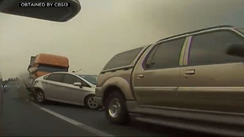 SACRAMENTO - Terrifying video of an 18-wheeler plowing through nine cars on a busy interstate was captured in California.