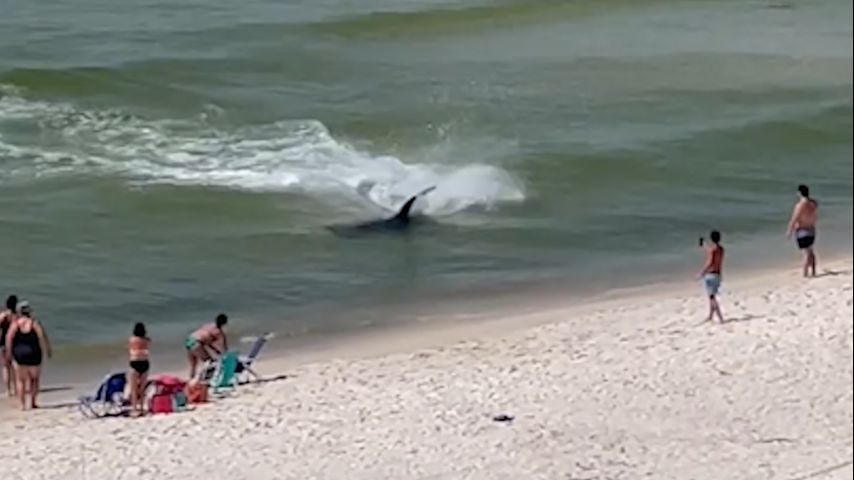ORANGE BEACH, Ala. - A hammerhead shark was caught on video swimming in shallow water and thrashing mere feet from bystanders at a popular Gulf Coast vacation spot.