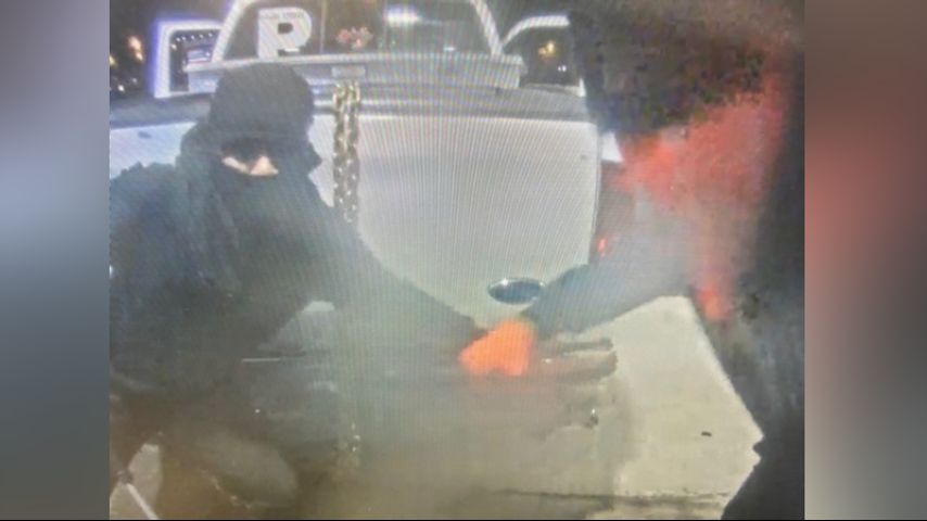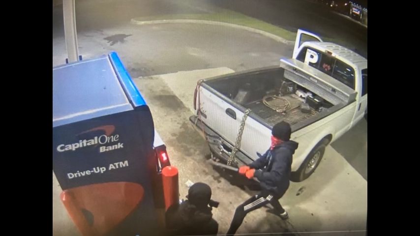 The crime was caught on camera around 3:30 a.m. Tuesday outside a Capital One bank on Florida Boulevard. The two masked suspects are seen in surveillance video ripping open the machine with crowbars, with a pickup truck carrying a heavy-duty chain just feet away.