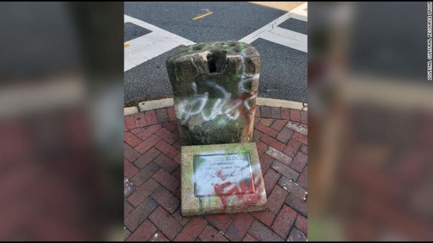 The slave auction block became a site for protests and was recently tagged with red, green, and white spray paint.