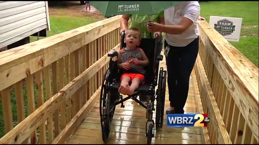 The volunteers from Turner Industries and Rebuilding Together Baton Rouge built two-year-old Brantly Williams a wheelchair ramp so he can easily get in and out of his house. Williams lost sight in one eye and lost many of his motor skills after a four-wheeler he was riding crashed into a tree a few months ago.