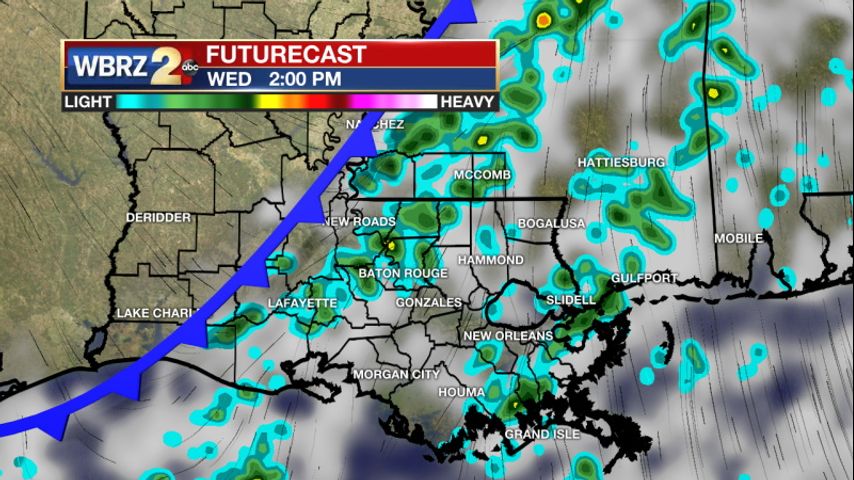 Wednesday: On Wednesday, the moisture will build causing some prolonged periods of rain. The first showers and storms will start early in the morning out ahead of a cold front. The cold front will push through from northwest to southeast starting around noon and it will spark up showers and storms as it goes. The rain will be heavy at times and will span the entire WBRZ viewing area. Temperatures will be in the upper 70s between the rain. Since this rain will be associated with the cold front, there will be slightly cooler and drier conditions on the other side. Everyone will be mostly clear by the evening hours. Overnight temperatures will be in the low 60s.