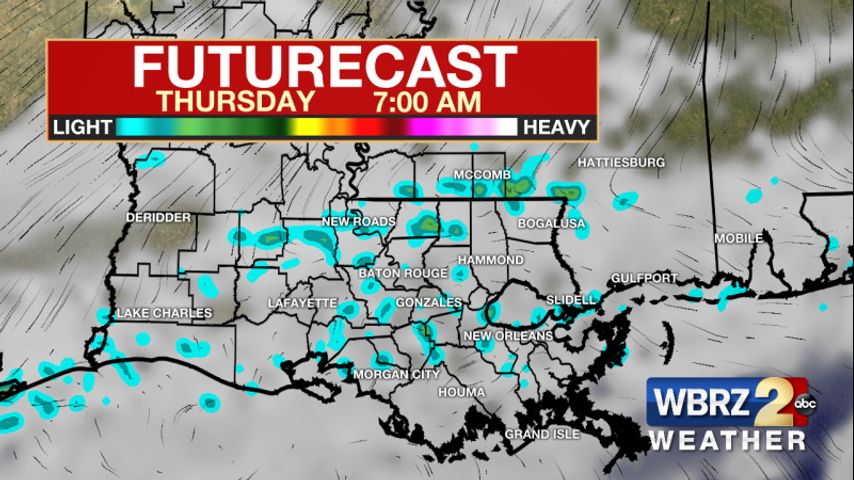 Up Next: Thursday morning will be mostly cloudy and fog may form as well. Scattered showers will be on and off along a stationary boundary starting Thursday morning. Showers will be most likely for areas north of Baton Rouge, but a few will sneak south throughout the day. It will not be a washout, and there may even be some sun in between the rain. Temperatures will continue to be in the low 70s. That same boundary will continue to wiggle around our area through the weekend creating a similar pattern. You can expect temperatures near 70 and scattered showers here and there through the weekend and into early next week. Click here to see the 7-day forecast.