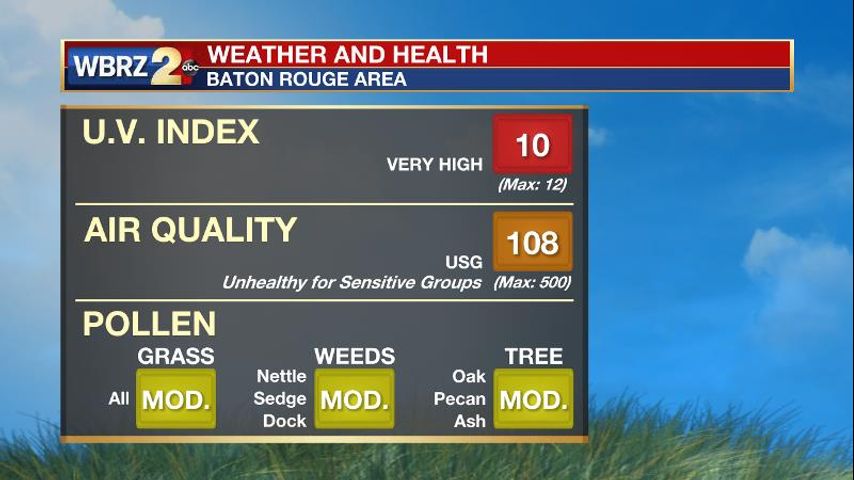 When the weather is nice, we are more prone to some negative health impacts. Several days after rain with continued sunshine result in increased allergens. Due to the high spring sun angle, the U.V. Index is very high making sunburn times in the 15-minute range. All of this nice weather has been created by a ridge of high pressure, which also results in sinking, poorly mixed air. This makes it difficult for clouds and showers to form but also allows pollutants to settle and ozone to increase. An *AIR QUALITY ALERT* has been issued for the third straight day in the Baton Rouge area. Levels are low enough that only those with breathing sensitivities such as asthma would be affected by spending longer periods outside. You can reduce emissions by driving less and refueling very early or very late in the day.