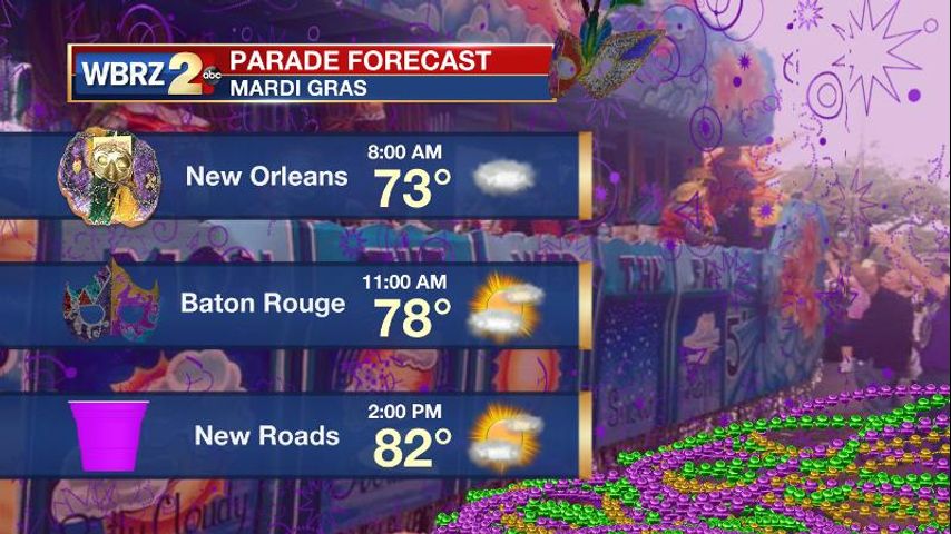 Today and Tonight: In the Baton Rouge area, mainly dry and mostly sunny conditions are expected for Mardi Gras which should go down as one of the warmer “Fat Tuesdays” in recent memory. High temperatures will climb into the low or even mid 80s. Winds will be out of the south at 5-10mph. Overnight will be partly cloudy and sticky with lows in the upper 60s.