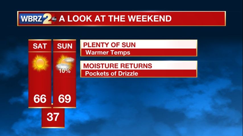Up Next: Sunny conditions through much of the weekend, but a weak system will bring areas of drizzle in the forecast Sunday and Monday. The next substantial blast of showers and storms will occur Wednesday into Thursday, with some strong to severe storms possible.