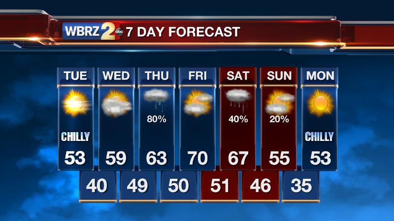 Up Next: Clouds will continue to thicken on Wednesday with high temperatures in the upper 50s. Showers return to the region as early as Wednesday Night with rounds of rain likely on Thursday. Lows will be near 50 with highs near 60. Generally, an inch is expected area-wide. A break will occur on Friday with partial sunshine and highs in the upper 60s followed by more showers Saturday.