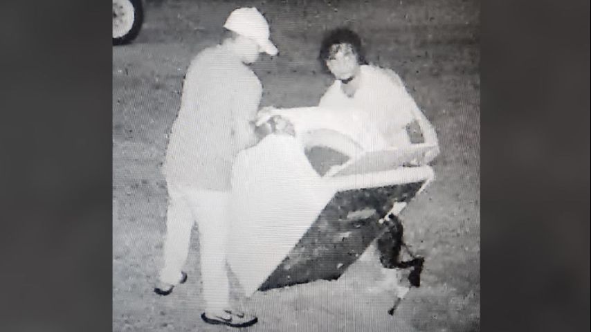 A security video from June 17 shows a black vehicle with a trailer attached. Around three in the morning, the car pulls up behind the building next to a loading dock. Two men are seen lifting a washing machine onto the attached trailer.
