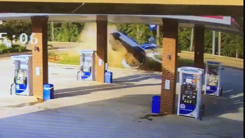 WATCH: Airborne car careens into gas station; No fire, no one hurt