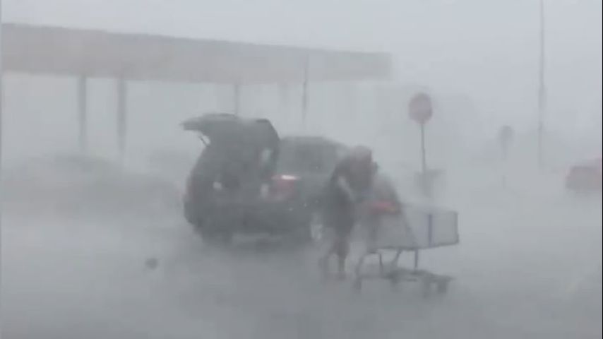 The video posted Tuesday shows a woman outside a grocery store in Hurricane, West Virginia in the middle of high-speed winds and heavy rain.