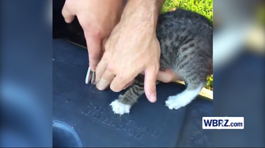 The St. Tammany Fire District says Eric Dupuy and Richie Carter were blowing out the engine bay Sunday when they spotted a kitten with its head trapped inside the base of a basketball goal.