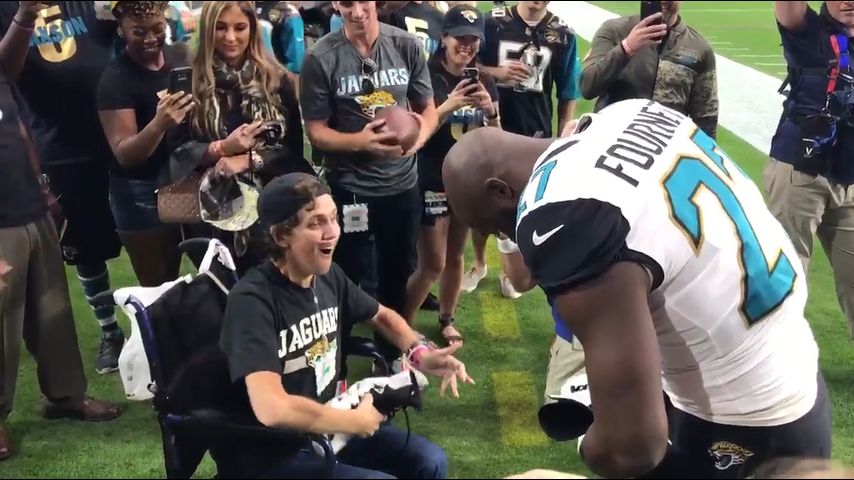 Before the Jaguars' game against the Arizona Cardinals Sunday the rookie running back made his way over to the sidelines and met with a wheelchair-bound fan. After Fournette shook hands with the young fan named Kevin, the former Tiger began signing his cleats and handed them over.