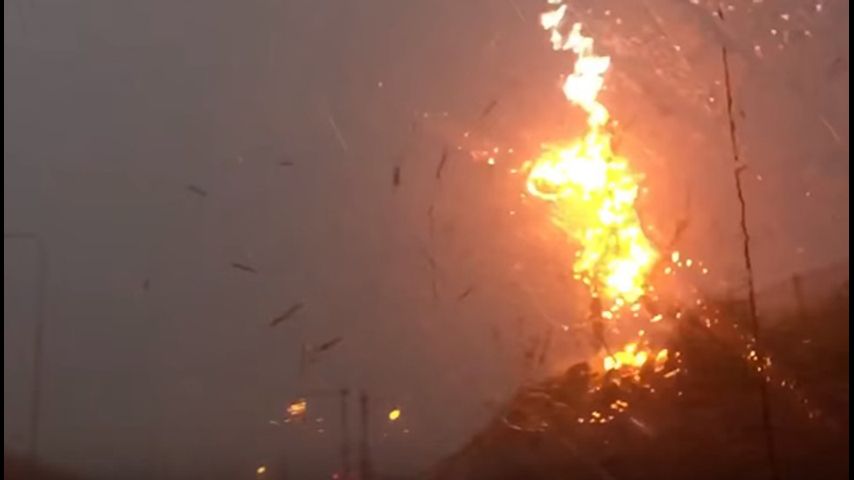 As she proceeded down Irving Park Road, a line of thunderstorms was moving across the northern part of Illinois. Her camera was rolling when a bolt of lightning descended from the sky and shattered a wooden telephone pole into a Michael Bay-esque explosion of flames and splintered wood.