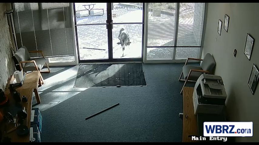 Footage posted by the company shows the animal pacing in front of the office before it rams its horns through one of the buildings glass doors. The goat then lingers outside for a few moments before deciding to go two-for-two, shattering the second door at the entrance.