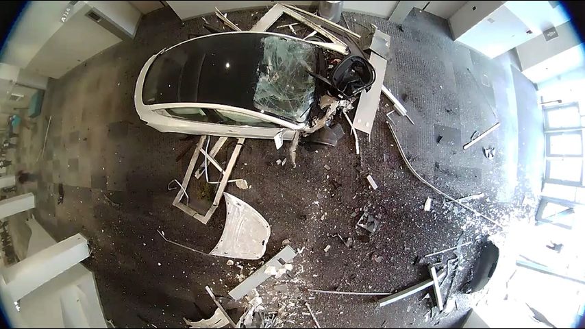 According to local police, the Tesla exited the highway May 4 going about 70 mph. It ran a red light and sped through the three-way intersection, crashing down steps, over a planter, and through a window before colliding with a pillar inside the convention center.