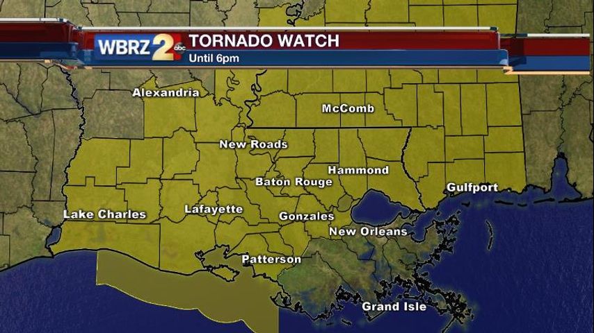 The National Weather Service has issued a *TORNADO WATCH* for the WBRZ Weather forecast area until 6pm Monday.