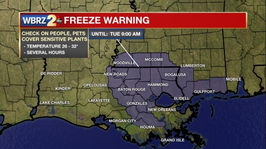 *FREEZE WARNING* for the shaded area. Temperatures are expected to drop below 32° for several hours. #WBRZwx pic.twitter.com/wFJlMoWIcz